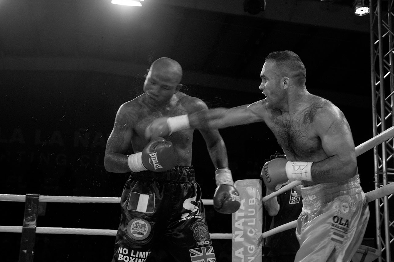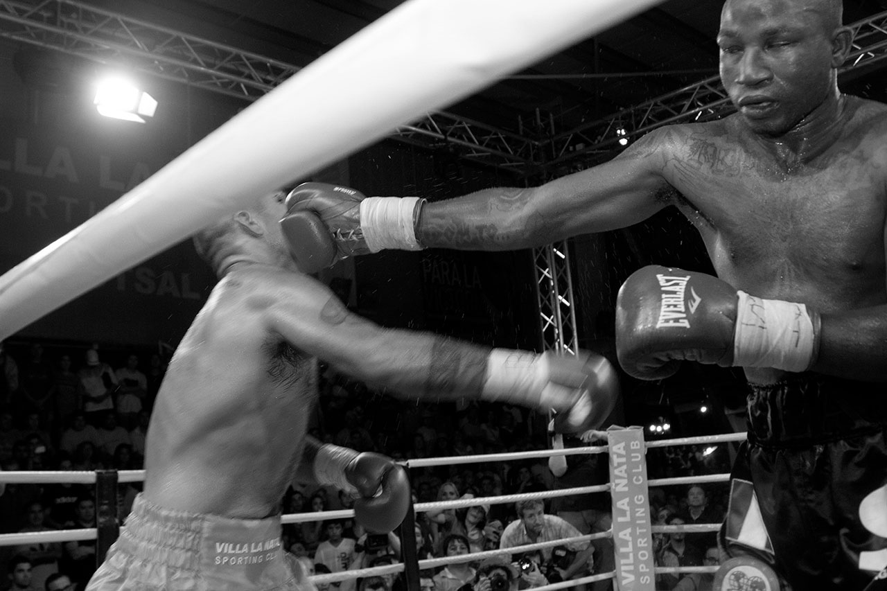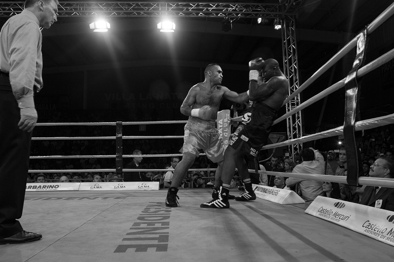 Noche de boxeo en Villa La Ñata. Pelea de Victor "El Tyson" Ramírez vs Ola Afolabi con victoria para el argentino. Tigre, Buenos Aires. 2015.